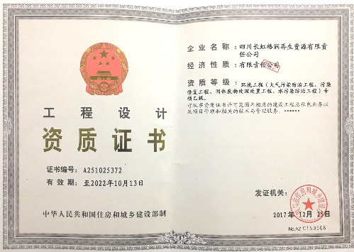 環保工程專業承包貳級、環境工程專項設計乙級、四川省污染防治工程甲級