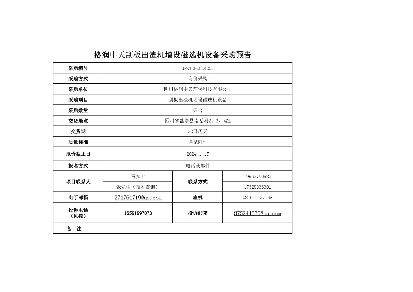 格潤中天刮板出渣機增設磁選機設備采購預告